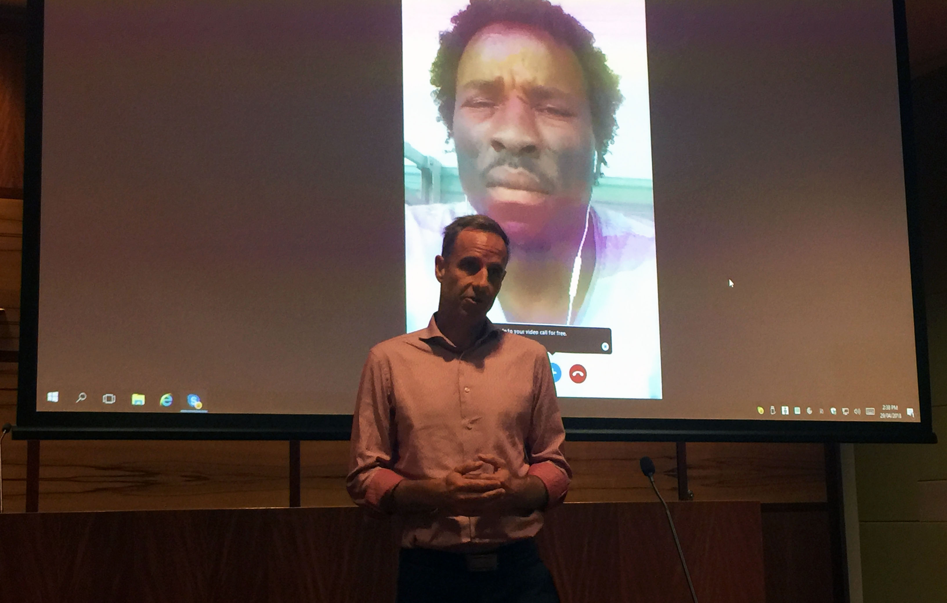 Senator Nick McKim & Abdul Aziz Adam speaking live on Skype, Photo taken by Mary Hakimi