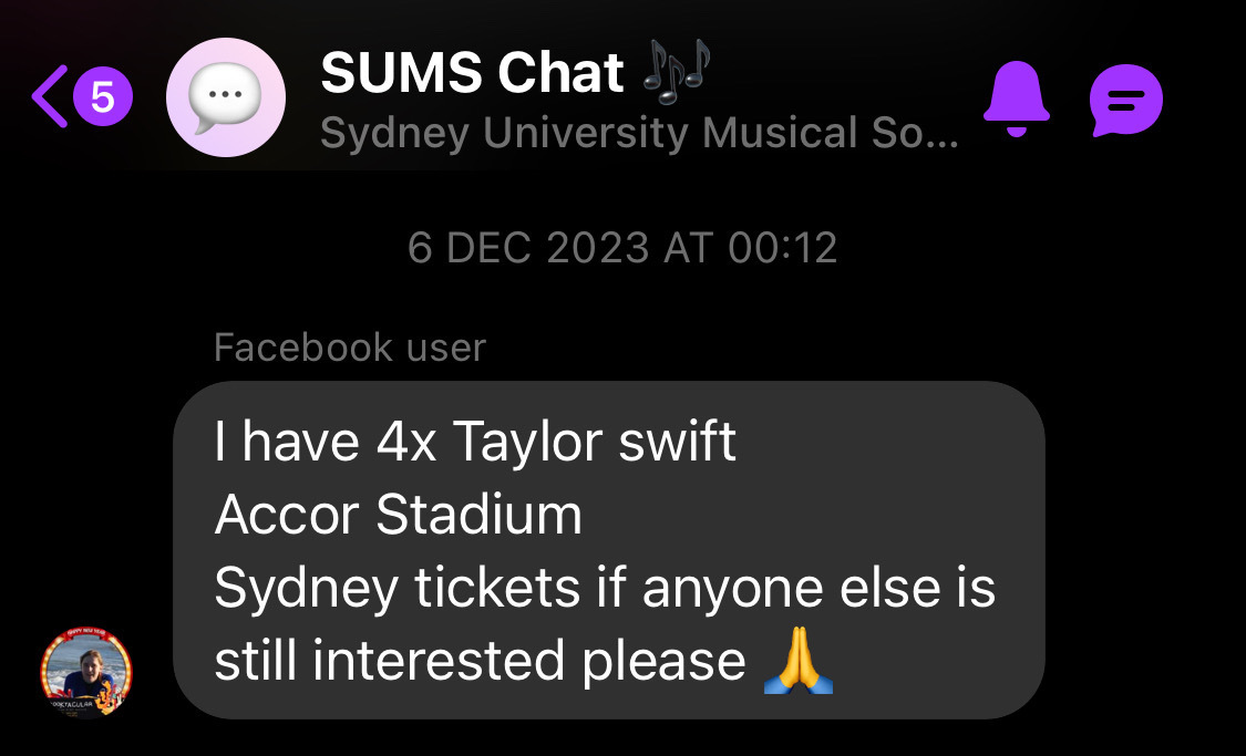 On December 6, 2023, Daniel Saunders saw a text from a familiar person on a familiar group chat, selling extra tickets to the Taylor Swift Eras Tour, coming to Sydney in February. Thinking of a Christmas gift for his girlfriend, he privately messaged this person.